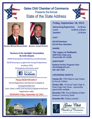 Join us for an informative luncheon featuring our NYS Senators Mike Ranzenhofer and Joe Robach on Friday, September 18th at the Legacy at Parklands in Chili.